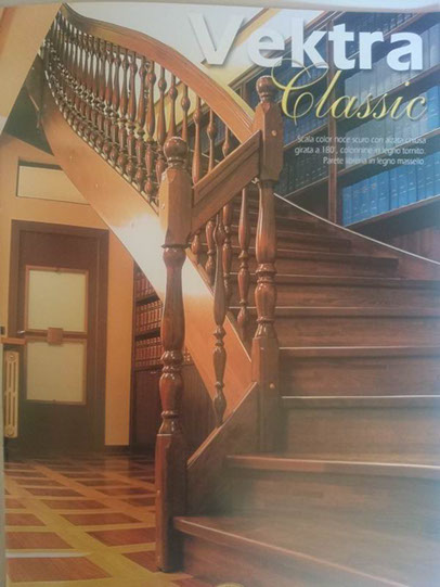 Scala in legno color noce con alzata chiusa, balaustra in legno massello